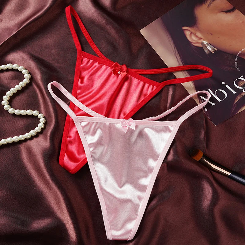2PCS Women's Thong Satin Sexy Seamless Underwear Female Bow Low Waist One Thread G-string Pure Cotton Crotch T-back