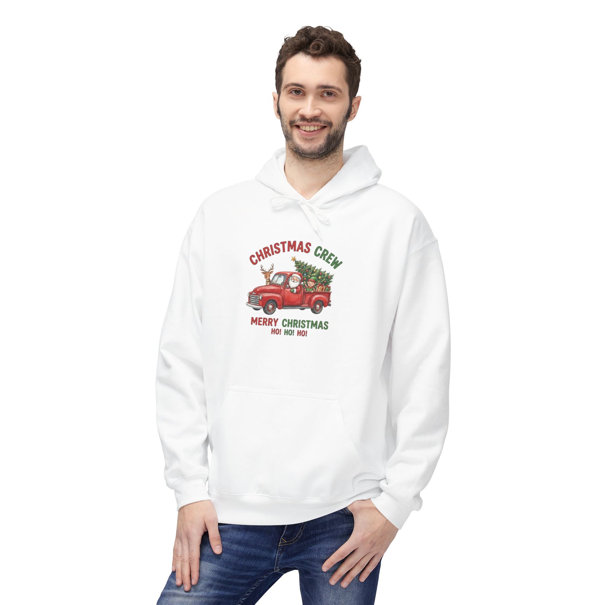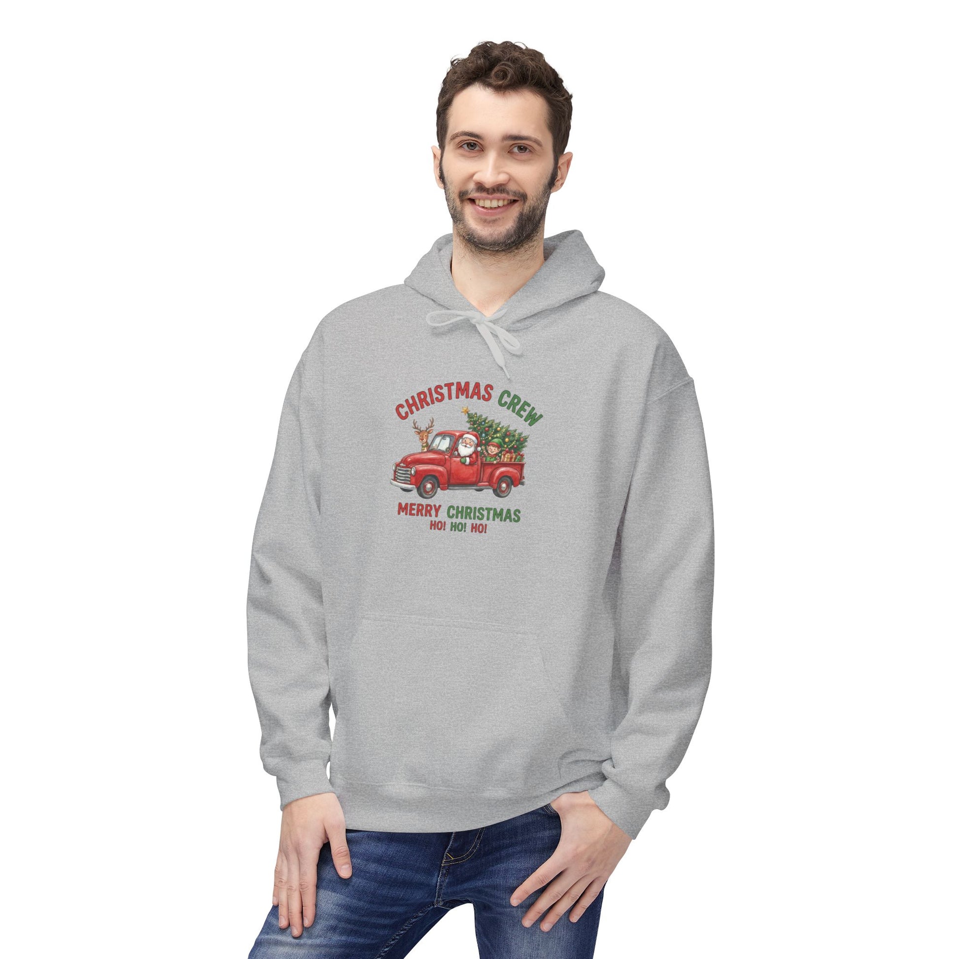 Christmas Crew Hoodie - Red Vintage Truck with Tree, "Merry Christmas Ho Ho Ho"