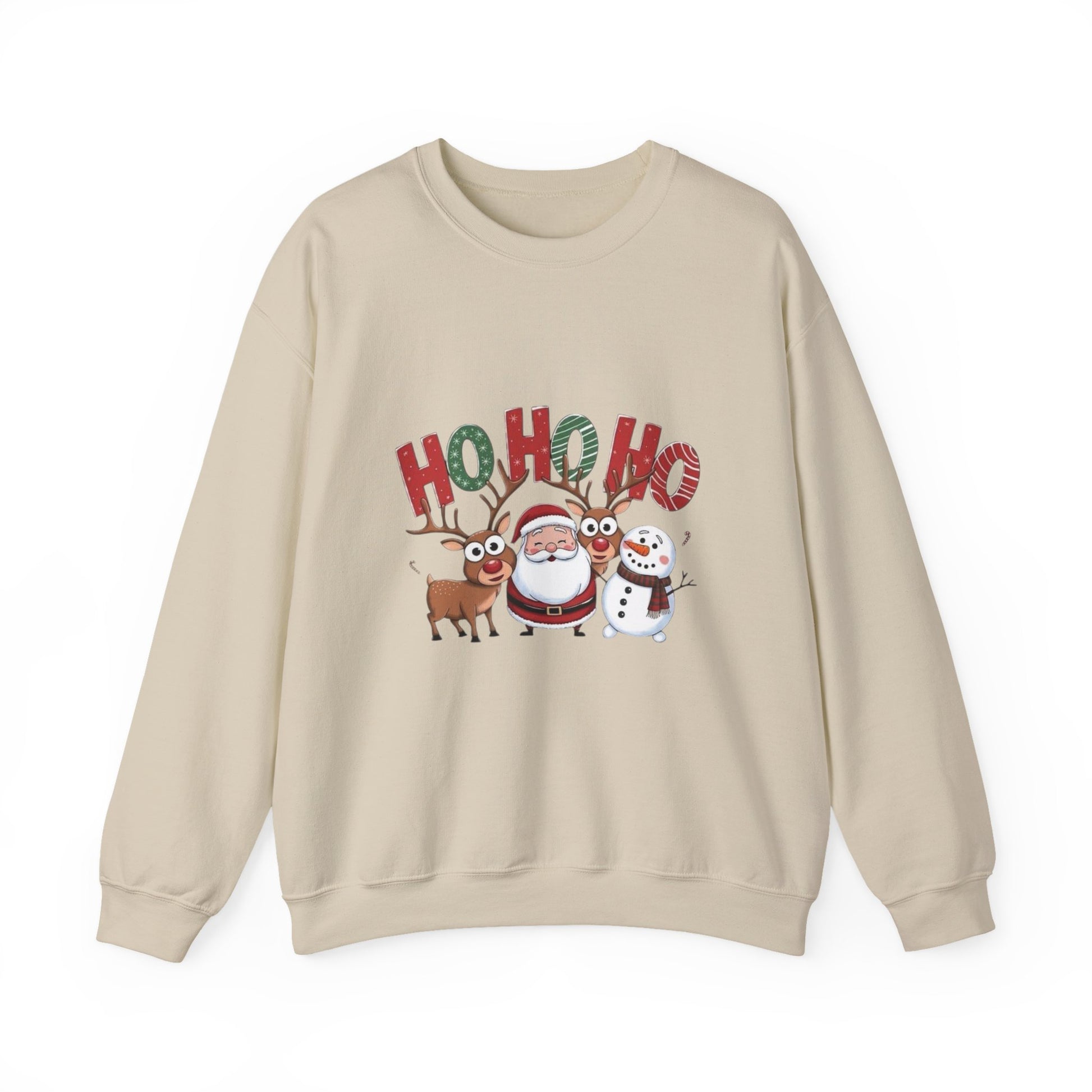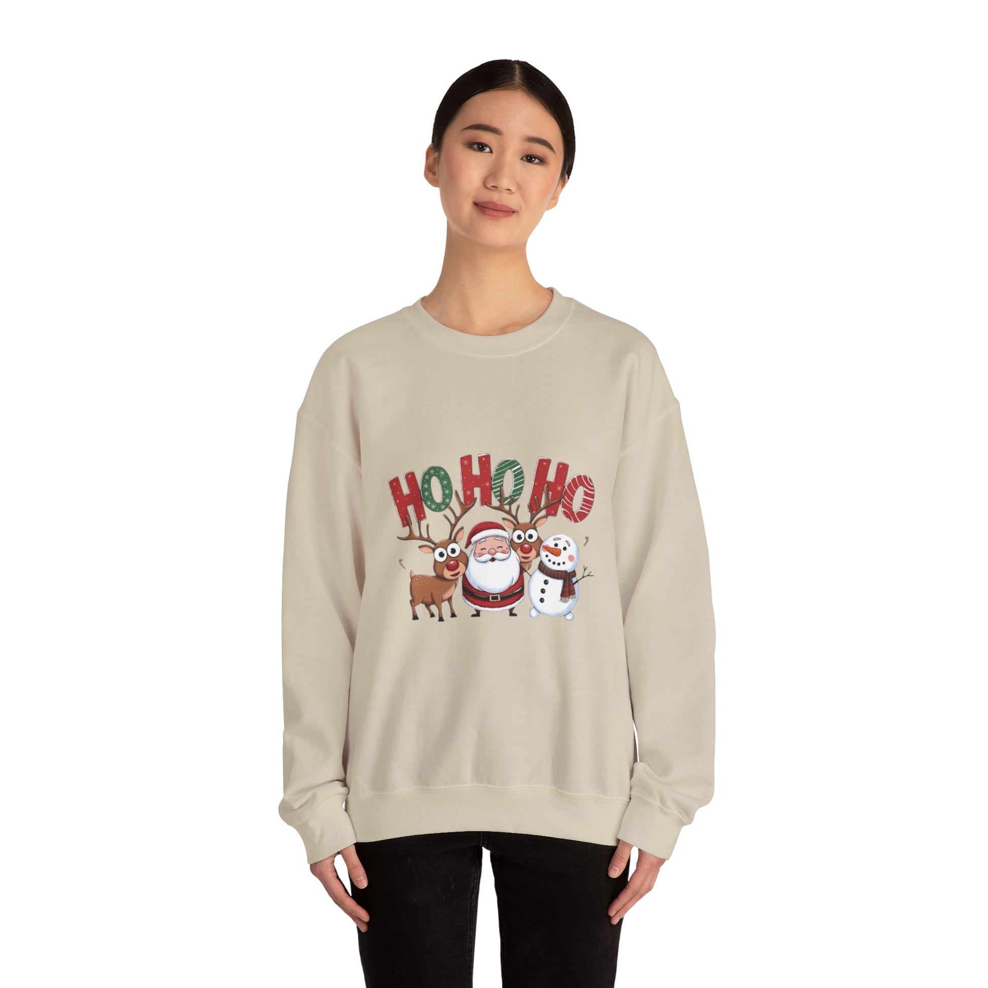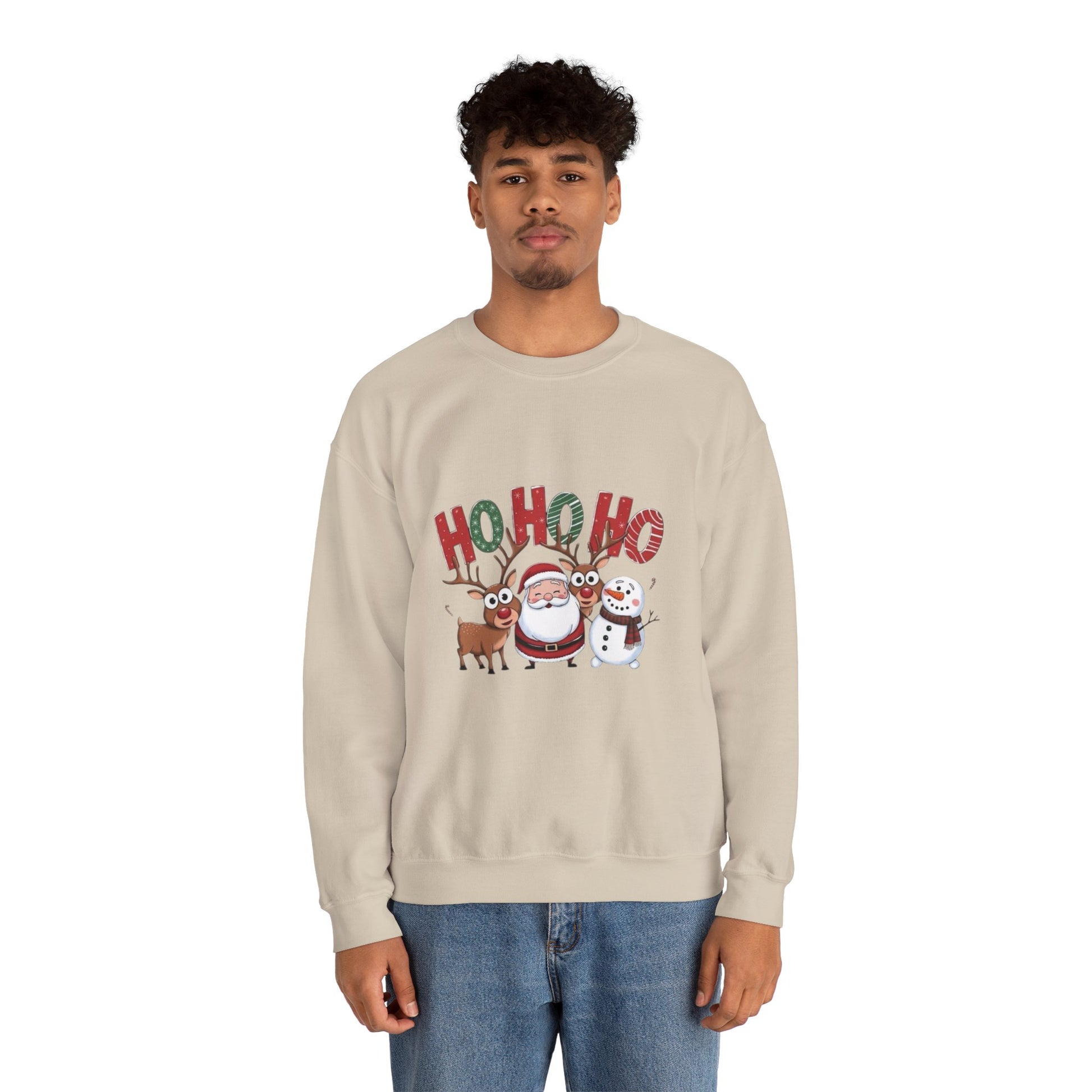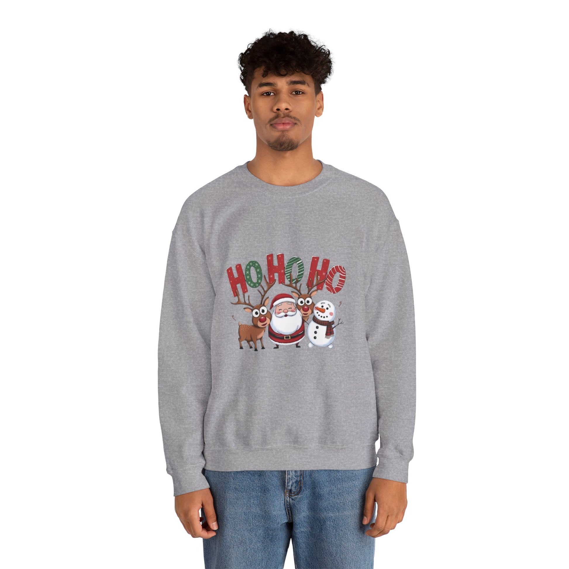 Christmas Sweatshirt — 'HO HO HO' Santa, Reindeer & Snowman Holiday Crewneck