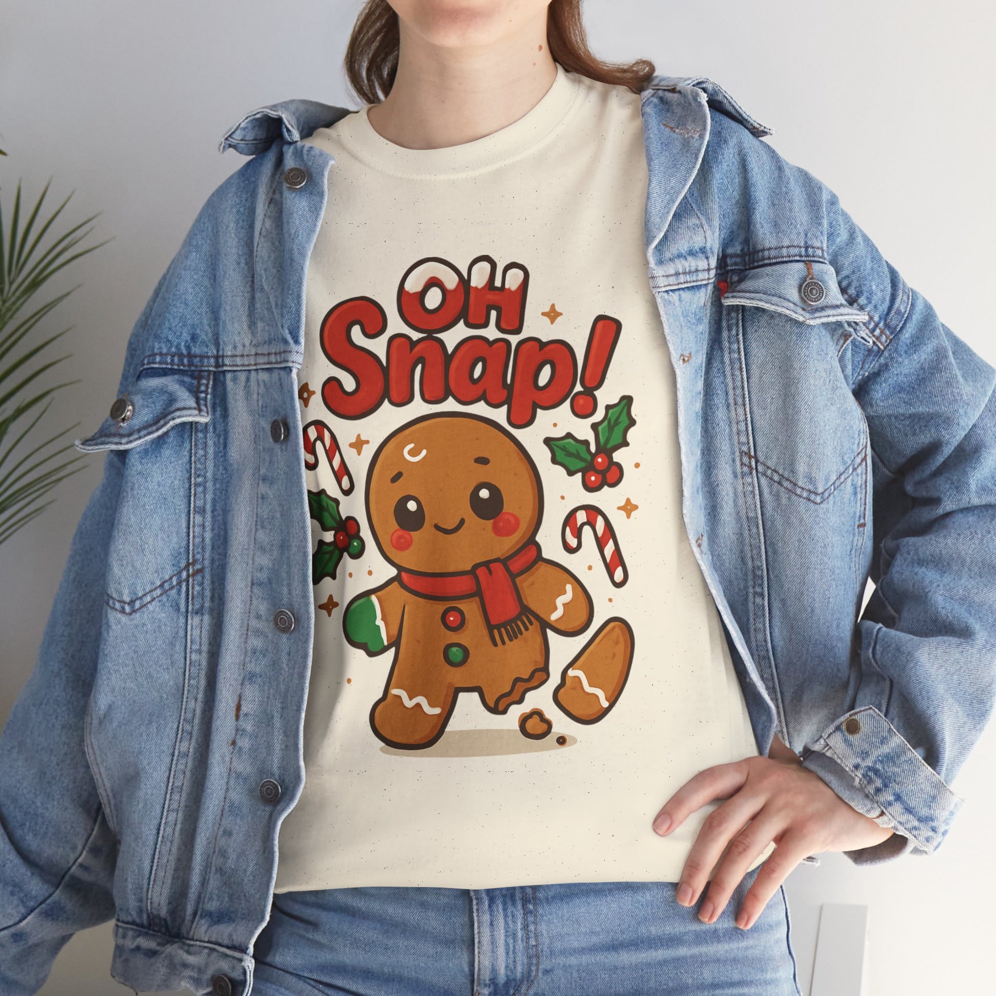 Crisp white tee with a playful, holiday-ready print: a cheerful gingerbread character mid-stride, bright candy-cane accents, holly sprigs, and the cheeky caption “Oh Snap!” The illustration’s warm browns, reds, and greens pop against the clean canvas of the shirt, creating an upbeat, whimsical vibe. Lightweight but durable, this shirt wears like a familiar favorite — soft at first touch, structured enough to keep the graphic looking sharp. Slip it on for cookie-baking mornings, casual holiday gatherings, or low-key seasonal photo ops. It reads as cozy and fun, a way to bring a little sugar-and-spice energy to everyday winter moments.