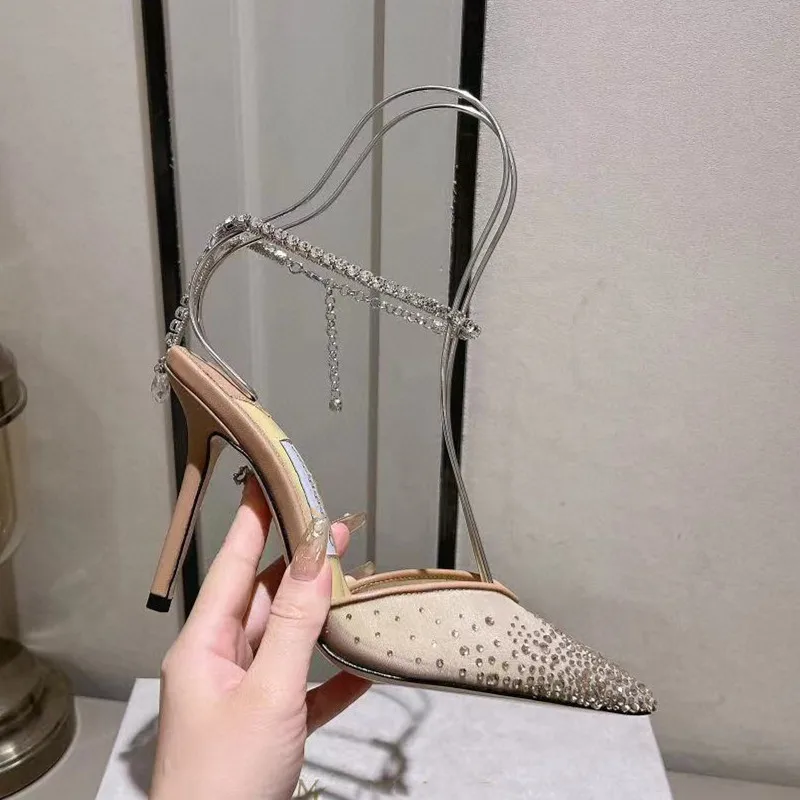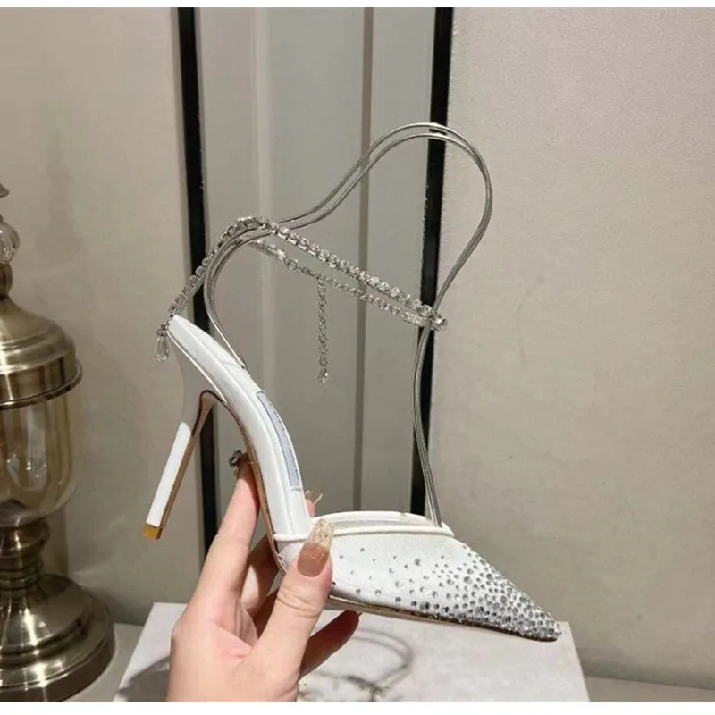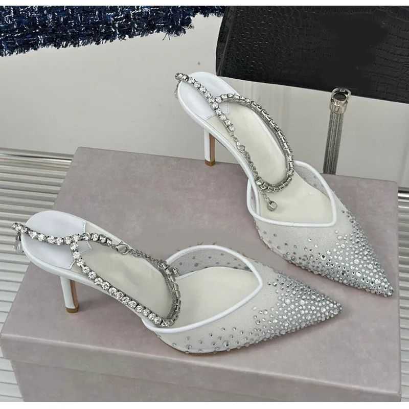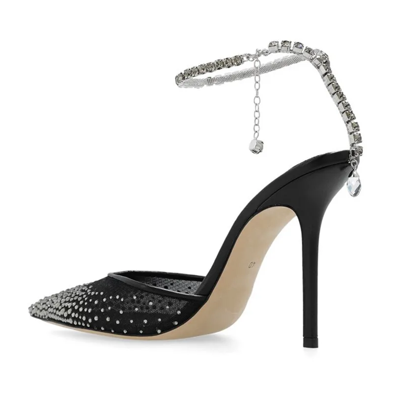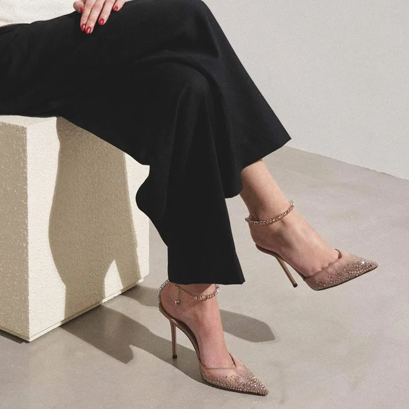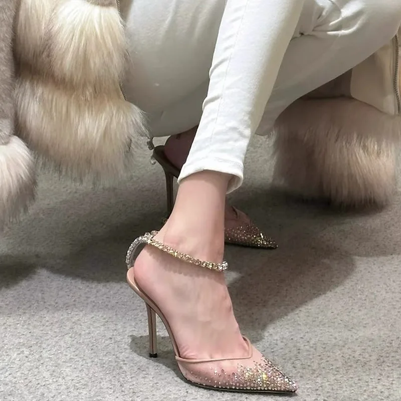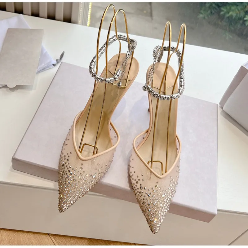 Star style Fashion Rhinestones Ankle Strap Women Pumps Elegant Pointed toe Mesh Slingback Stiletto High heels Office Dress Shoes
