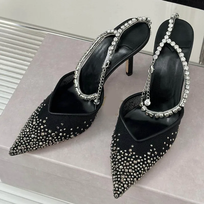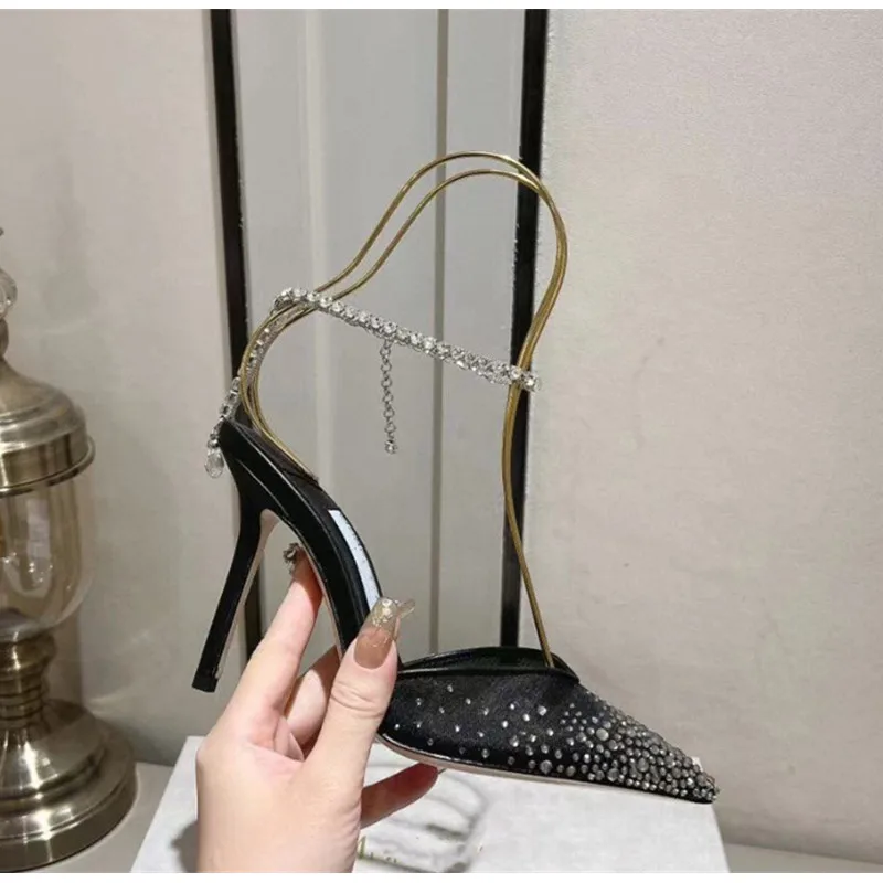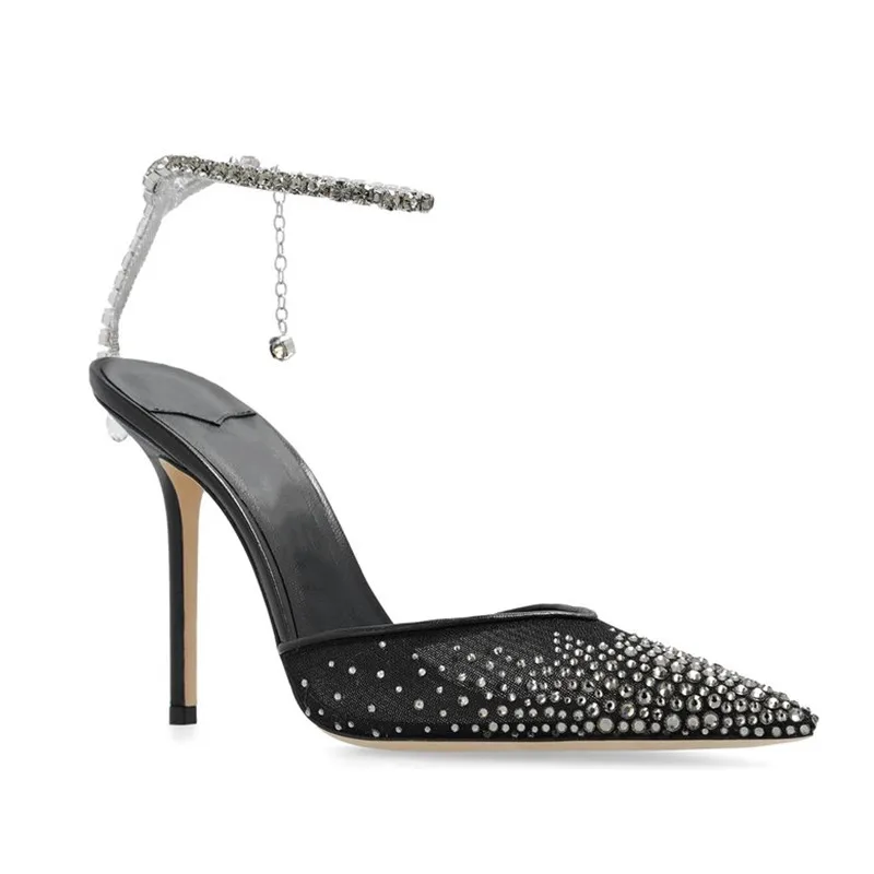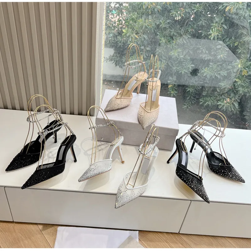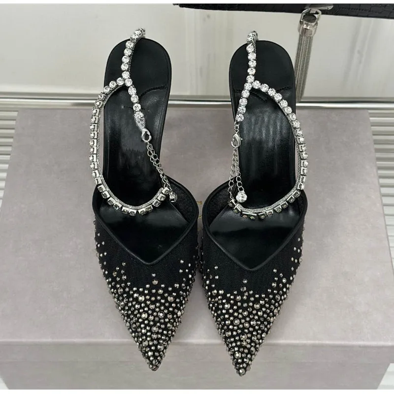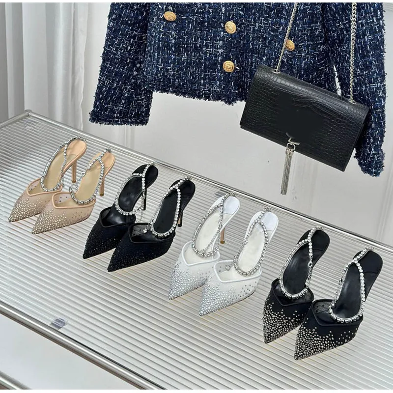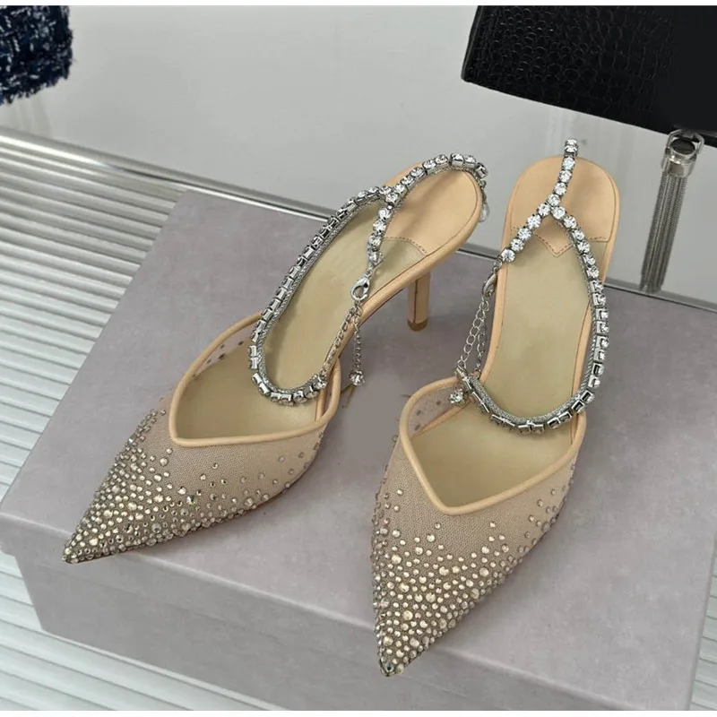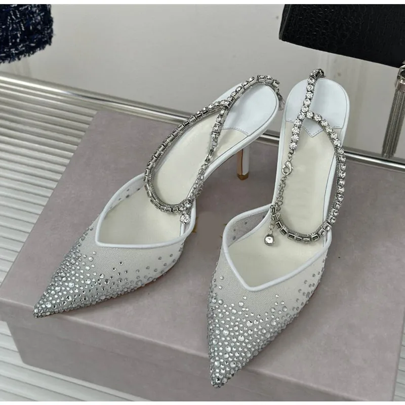Star style Fashion Rhinestones Ankle Strap Women Pumps Elegant Pointed toe Mesh Slingback Stiletto High heels Office Dress Shoes